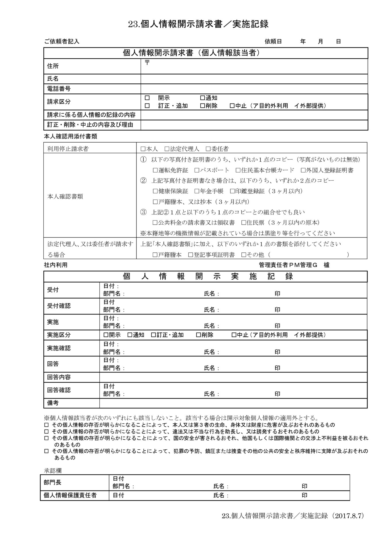 ・上記のご請求に基づき、個人情報の削除または消去をさせていただいた時でも、ご請求の際に提出いただいた請求書、請求された方の確認書類、回答書の写しは保管させていただきます